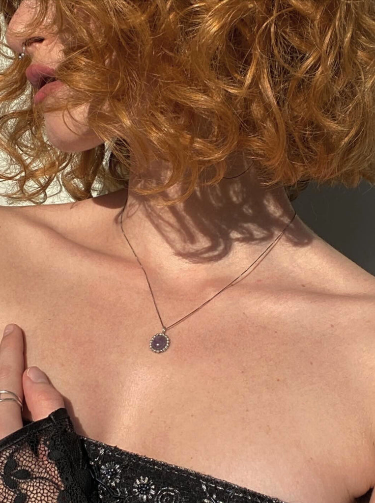 Χειροποίητο κολιέ ροζέτα με πέτρα από αμέθυστο. Η μεταλλική βάση του κολιέ καθώς και η αλυσίδα είναι κατασκευασμένα από ασήμι 925. Ο Αμέθυστος είναι ένα από τα πιο πνευματικά ορυκτά και ενισχύει τη διαίσθηση.